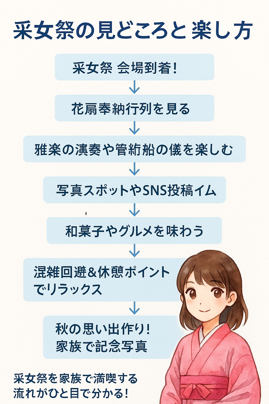 この記事を読めば、采女祭の楽しみ方から歴史、家族におすすめの立ち寄りスポットまで、ぜんぶ分かります。